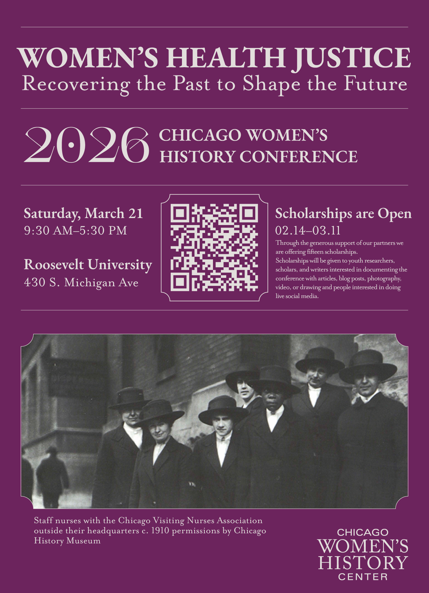 The Chicago Women's History Center is honored to host the second annual conference on Chicago Women’s History at Roosevelt University on Saturday, March 21, 2026. The theme for this year is Women’s Health Justice: Recovering the Past to Shape our Future and the conference has been created from an open call with our community and designed collectively with our community partners.