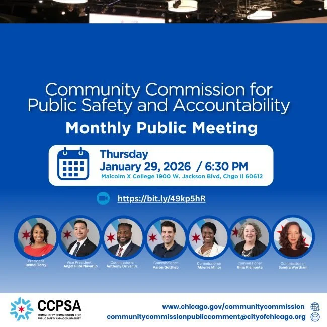 At the citywide Commission’s public meeting on Thursday, February 26, 2026, at Kennedy- King College, the Commission will continue the discussion about policing activities when immigration enforcement is happening on the ground across the city. The CPD Superintendent, COPA Chief Administrator, and Inspector General are expected to participate in the meeting.